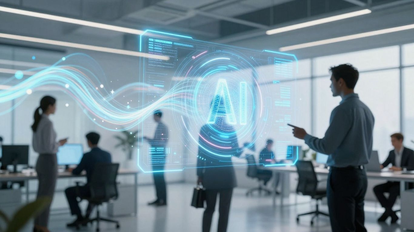 Profissionais colaborando com projeções de IA em escritório moderno.